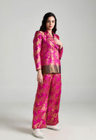 This exceptional double-breasted blazer and flared high-waisted pant set takes center stage in vibrant fuchsia pink. Crafted from stunning silk brocade sarees, this set enhances your style during festive occasions.